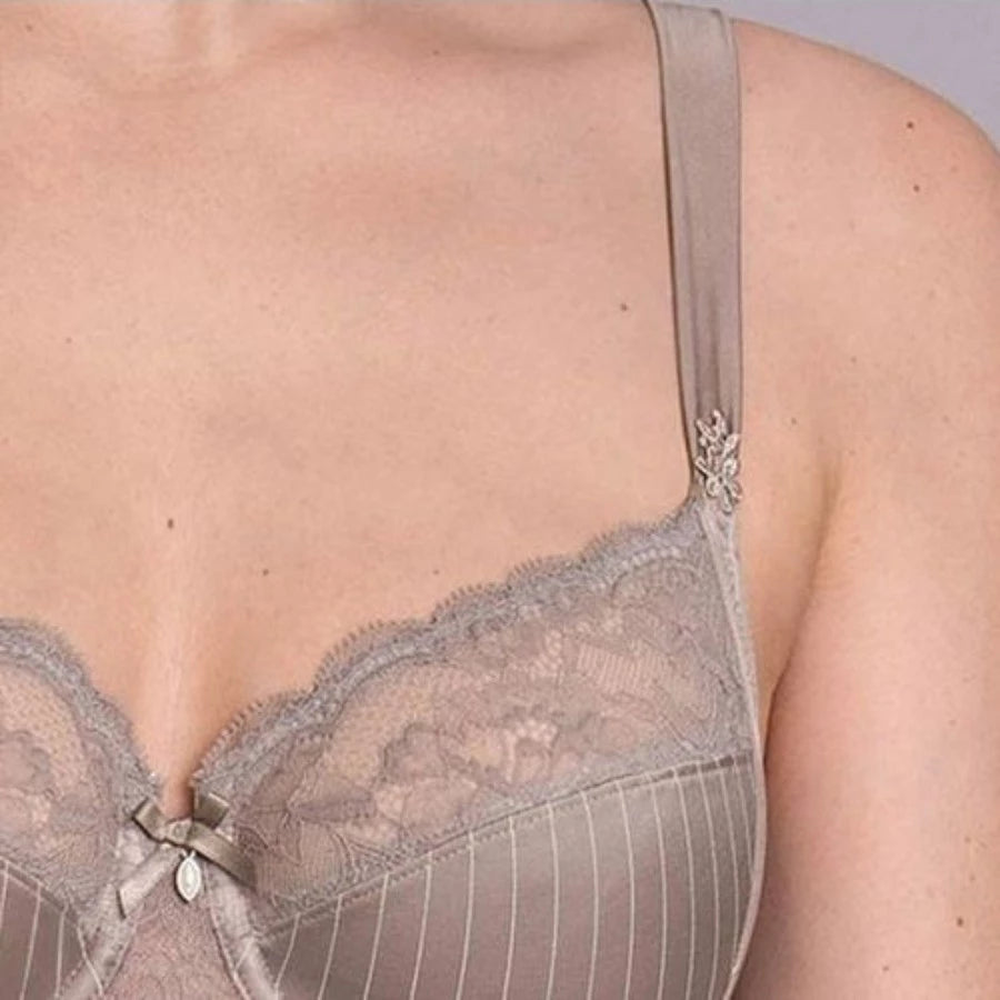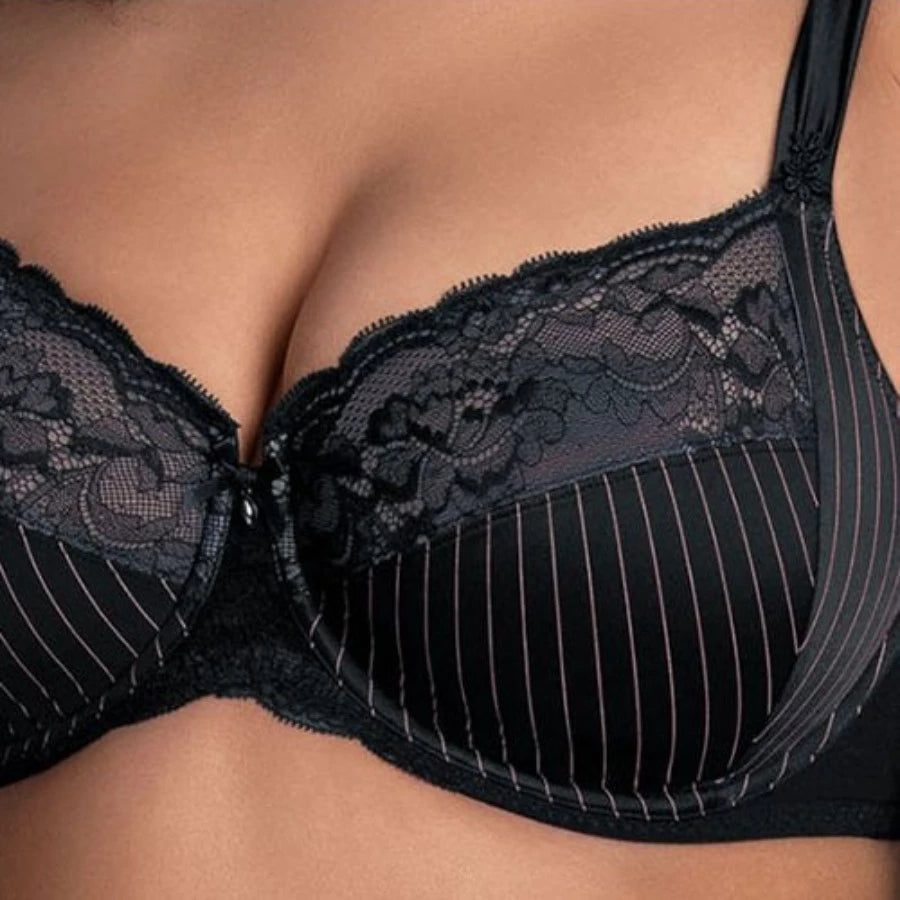 Descubre la elegancia y sensualidad del sujetador con encaje seductor y rayas elegantes, las copas divididas en tres partes y la banda de microfibra ofrecen un soporte cómodo. El borde continuo añade estabilidad, mientras que el lazo de satén y el colgante decorativo en el escote aportan un toque de ligereza. ¡Siente la "dolce vita" con este sujetador!
